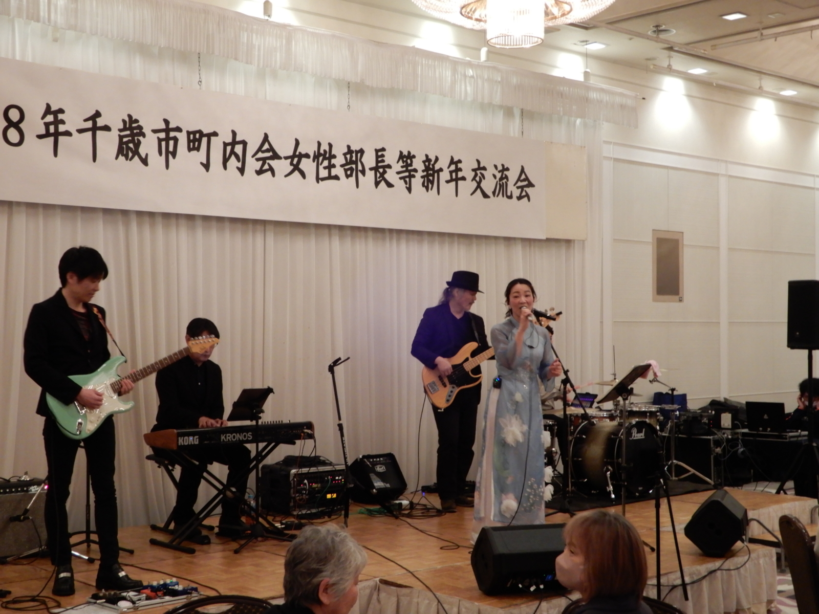 24町内会・自治会から総勢68名が参加し、新年の交流を図りました。この交流会をさらに盛り上げてくれたのは、昨年に引き続き「ヨルノグルニエ」さんによるバンド演奏で、アンコールを含めてポップスから演歌までたくさんの曲が披露され、会場は大きな拍手に包まれました。